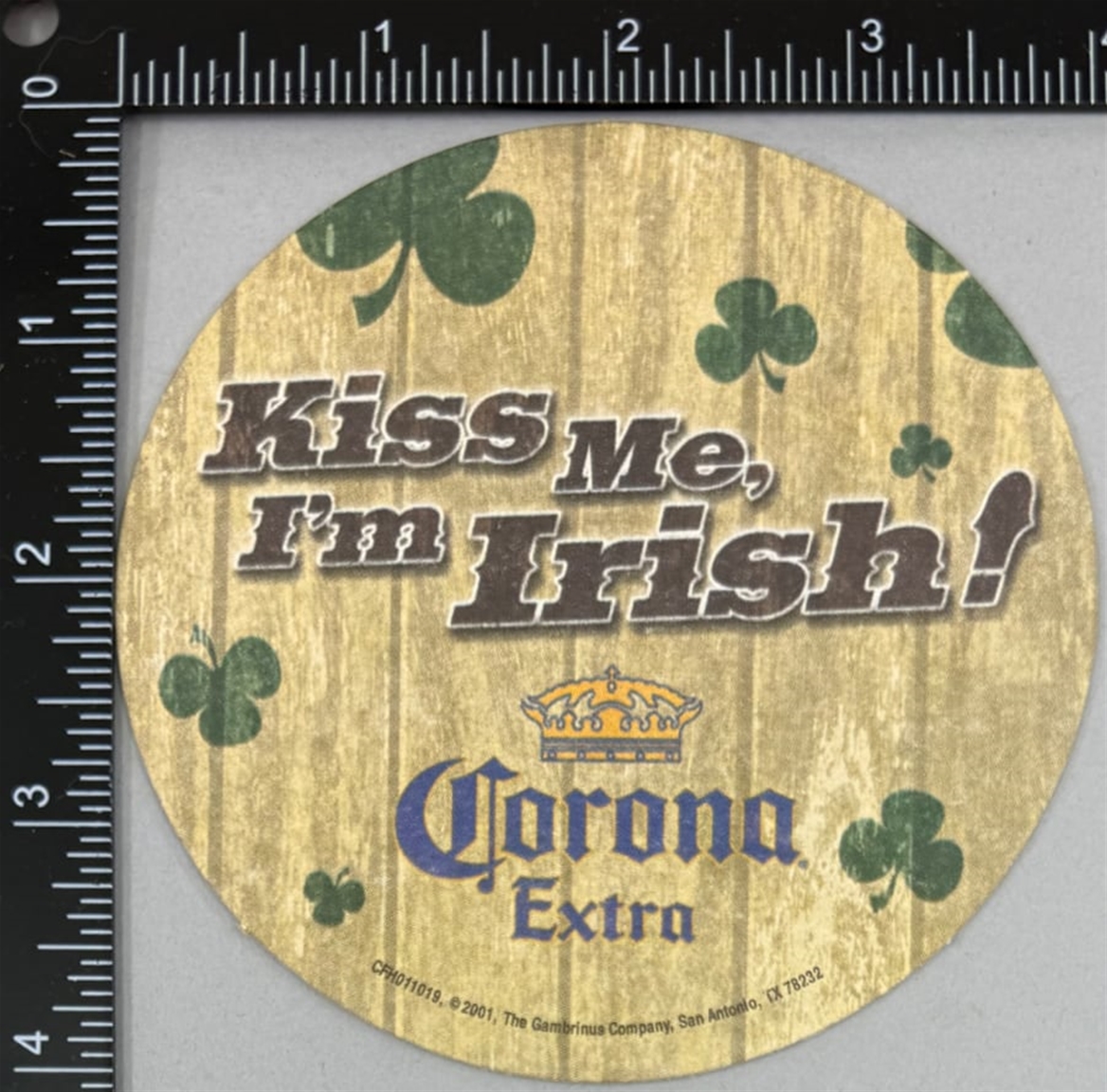 NEW OLD STOCK, NEVER USED: ©2001, beer coaster with the Corona Extra Crown logo, with shamrocks and Kiss Me, I'm Irish! The back of the coaster is blank. Across the bottom of the coaster The Gambrinus Company, San Antonio, TX 78232.
