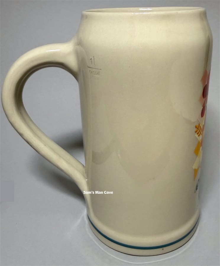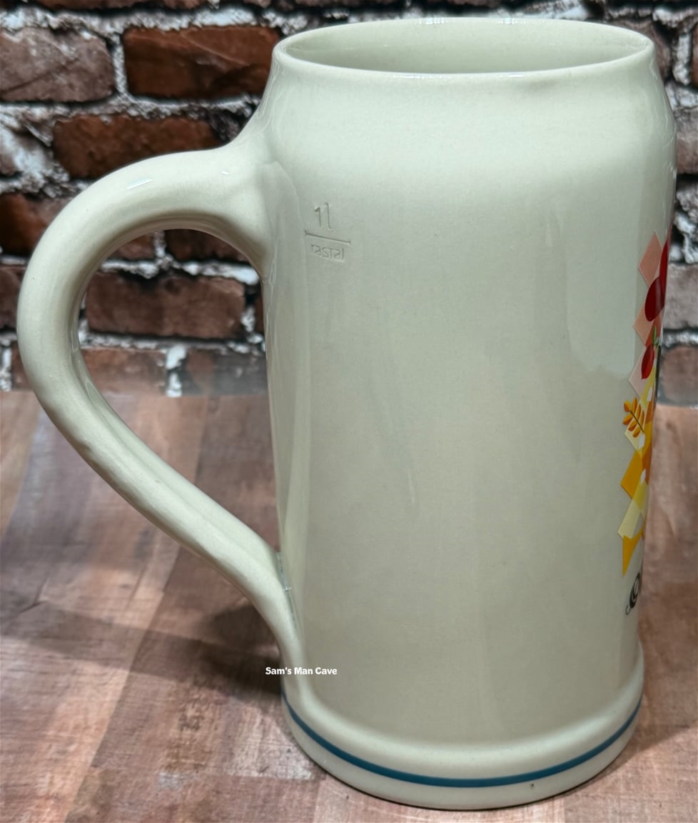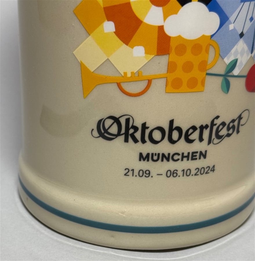 NEW: 7 1/2" tall, one liter ceramic mug featuring the official artwork for the 2024 Munich Oktoberfest. Each mug is dated on the front with a copy of the artist's signature on the bottom. Made by Rastal of Germany. This mug does have some marks that are shown in the photos.