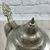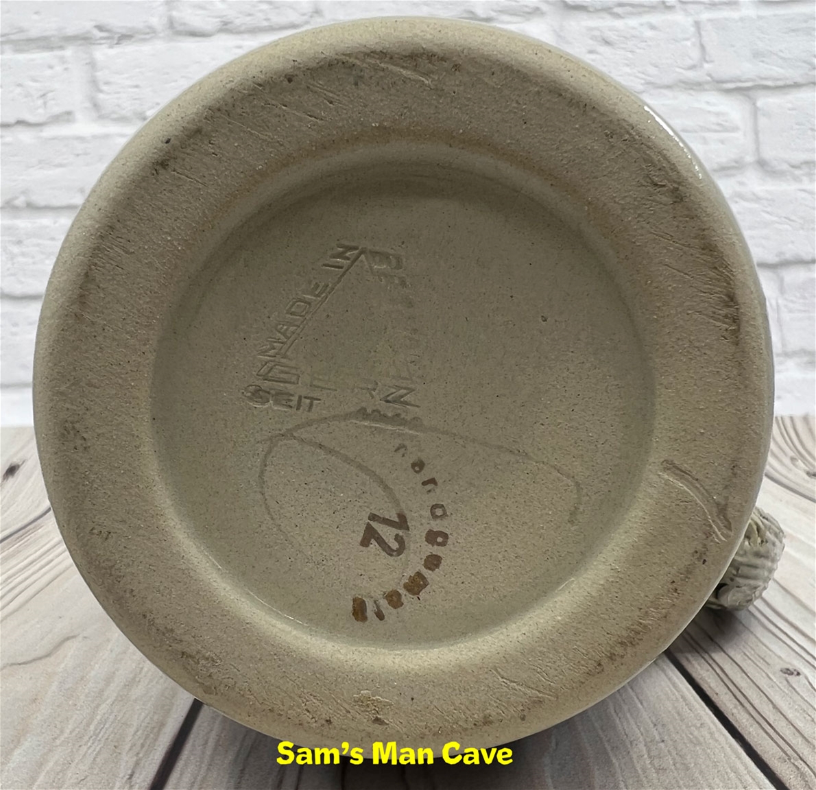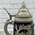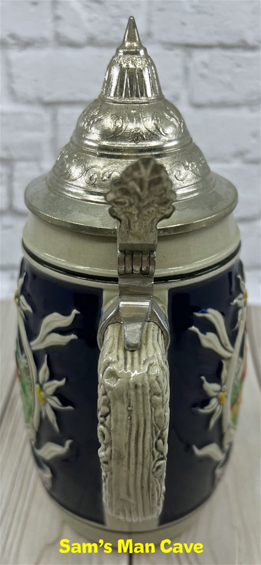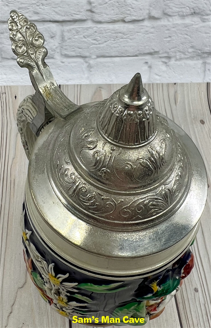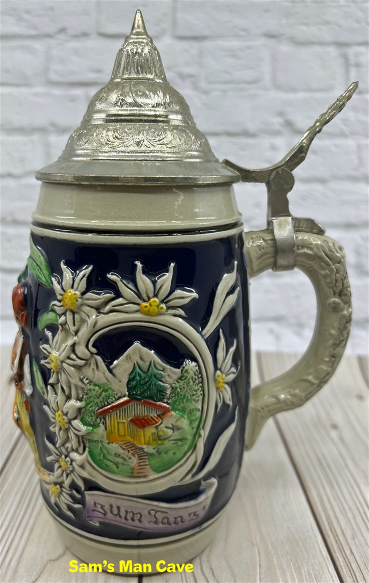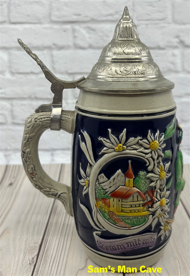 8 1/4" tall stein with pewter lid. The center panel of the stein features a man embracing a woman, accented with edelweiss. Each side features a building with a banner that continues from one side to the next that reads "somm mit mir zum tanz" which translates "come to the dance with me." This is an older, original item, please examine the photos carefully.