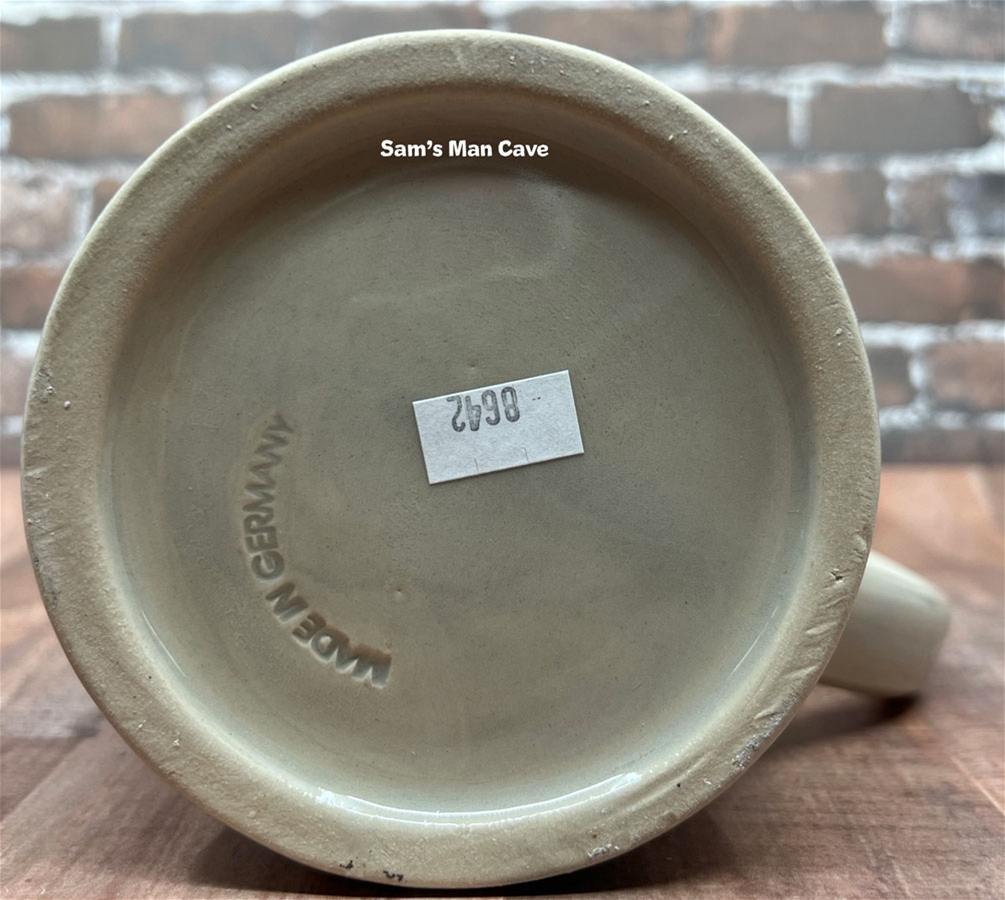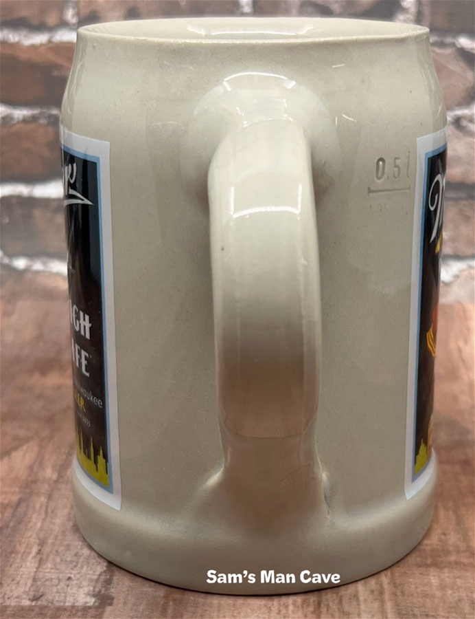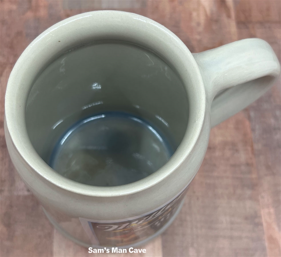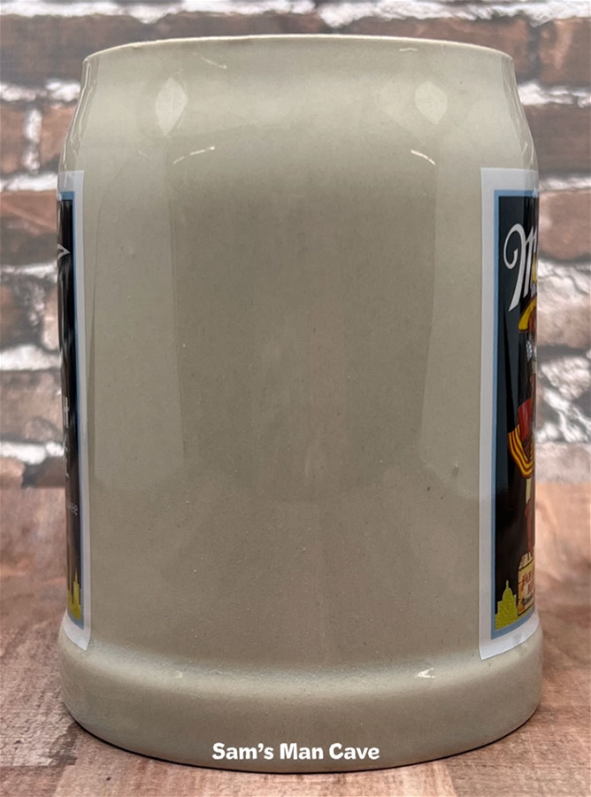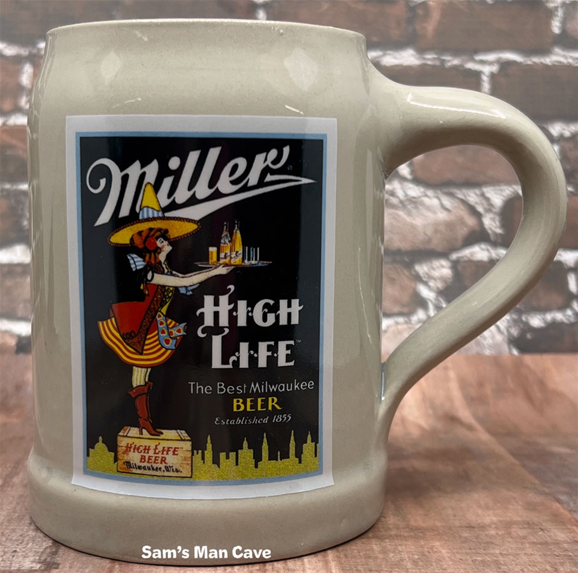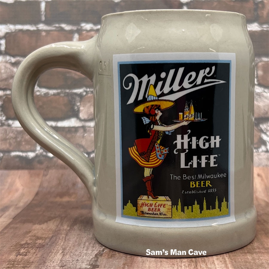 NEW OLD STOCK: .5 liter, 5" tall, hofbrau mug with a reproduction of the Miller High Life The Best Milwaukee Beer Established 1855 advertisement, complete with the Miller Girl.