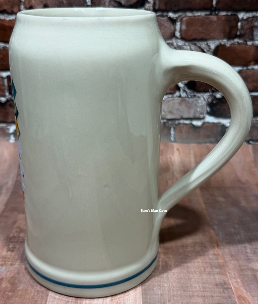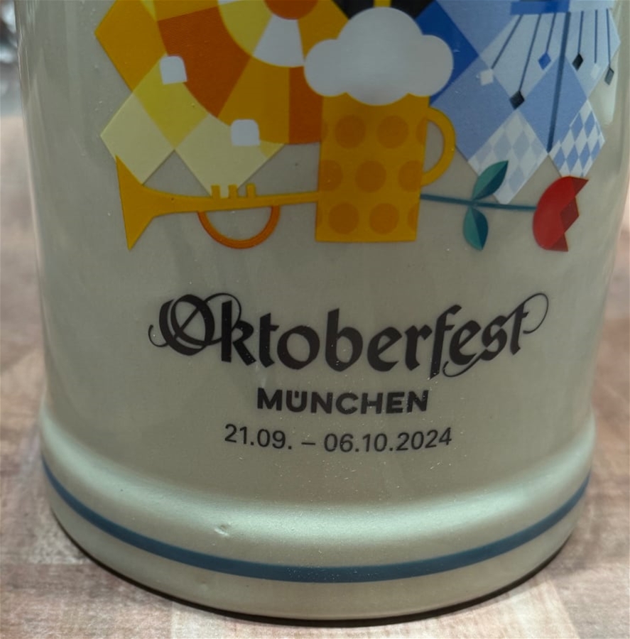 NEW: 7 1/2" tall, one liter ceramic mug featuring the official artwork for the 2024 Munich Oktoberfest. Each mug is dated on the front with a copy of the artist's signature on the bottom. Made by Rastal of Germany. This mug does have some marks that are shown in the photos.