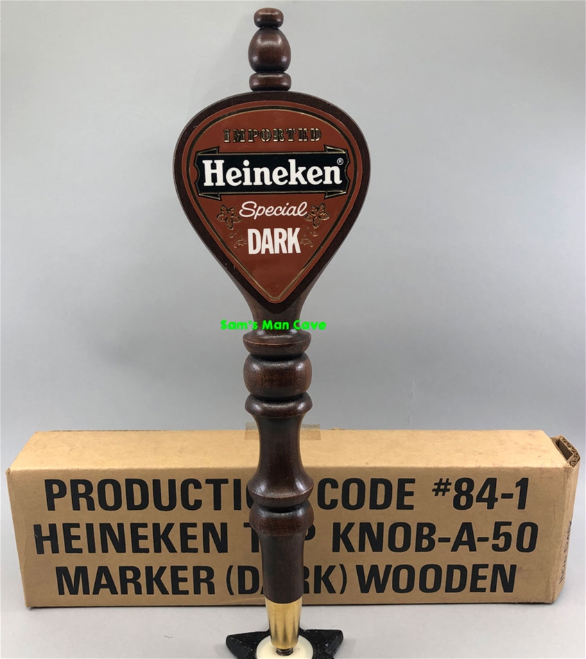 New in box, vintage tap, approximately 12 7/8" tall wood tap handle with the same Heineken Special Dark logo on the front and back. This is an older original item, please examine the photos carefully.